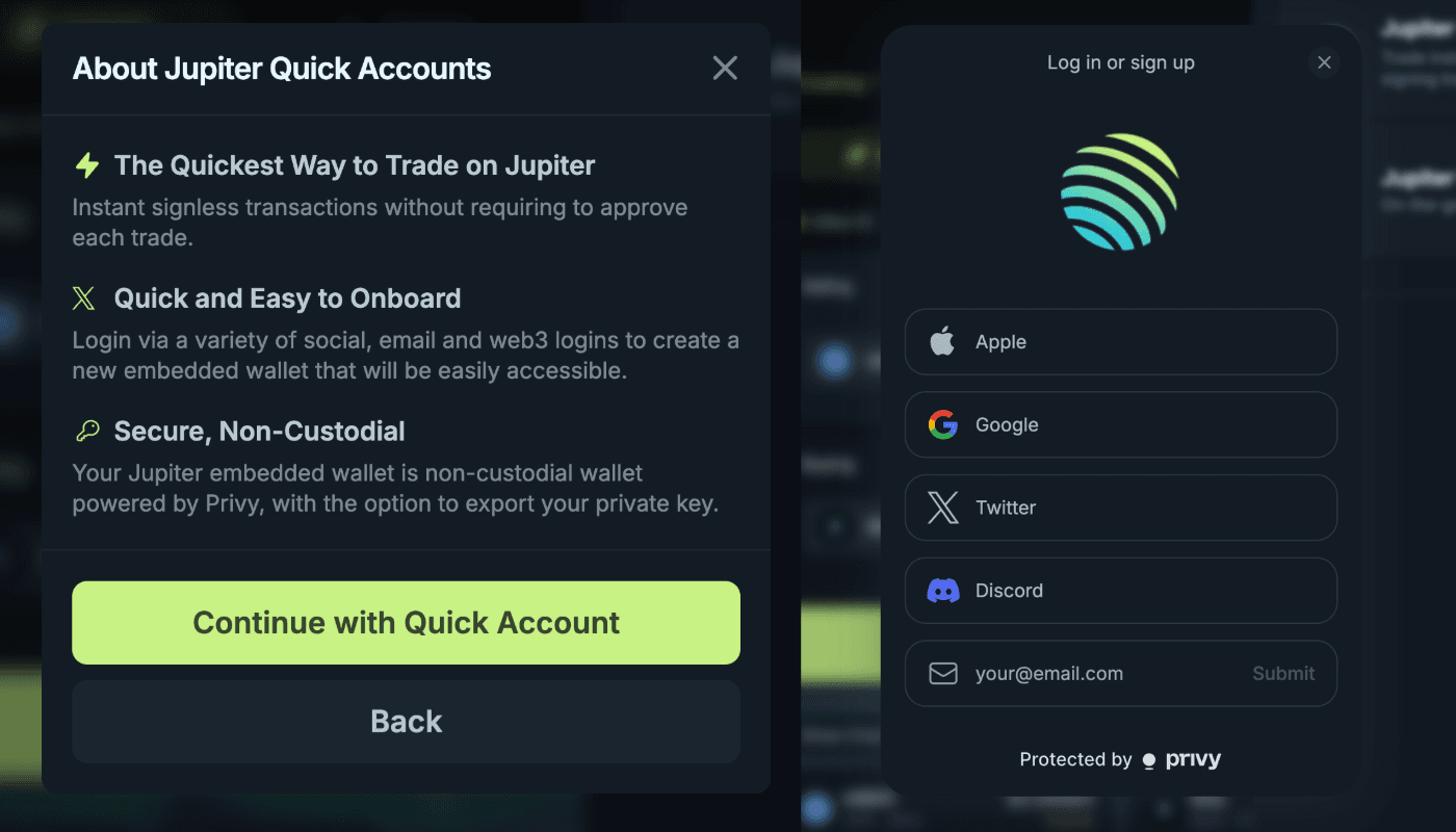Built on top of these features is an onboarding experience designed to be intuitive, not just for first-time users, but for pro traders who expect speed, control, and minimal friction. By partnering with Privy, Jupiter ensures that anyone can go from login to first trade in seconds, with secure, self-custodial access and no wallet setup required.