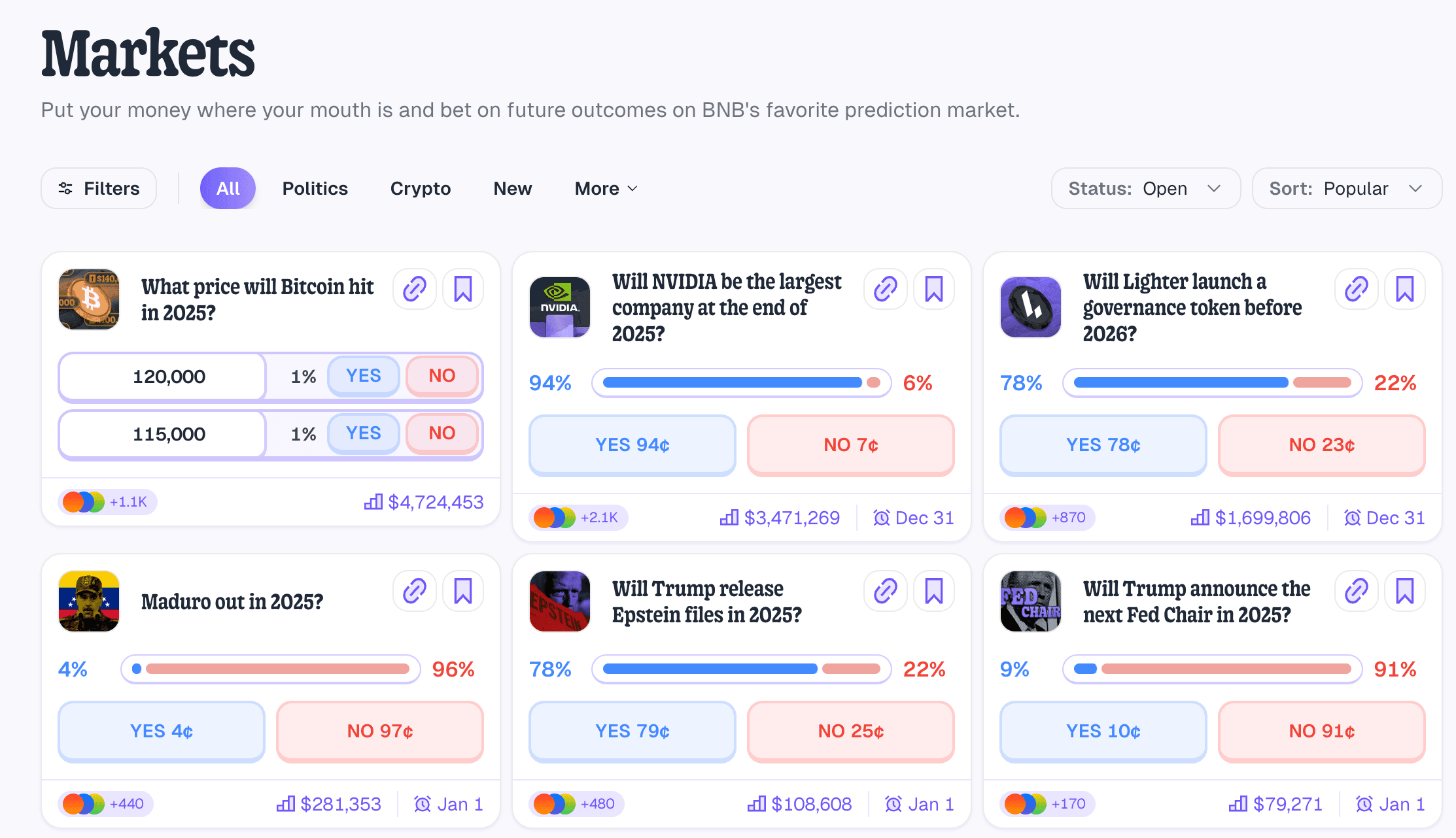 Predict is a prediction market built on BNB Chain that allows users to trade on future outcomes across categories including politics, crypto, and sports. Markets support both binary and multi-outcome structures, with prices reflecting implied probabilities and settling at expiration. Predict places an emphasis on accessibility and education, walking users through how prediction markets work while supporting more advanced market types like bond-style markets. Outcomes are currently proposed via AI workflows and reviewed internally, reflecting a hybrid approach to market resolution.
