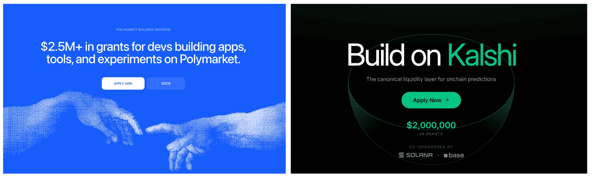 Polymarket offers a similar set of primitives through its Builders Program. Polymarket builder codes function as unique credentials that allow developers to enroll in a public leaderboard for volume activity and access the Polymarket Relayer API. Polymarket’s builder tooling is publicly accessible, enabling teams to begin building without an approval process. Like Kalshi, Polymarket also supports builders through a grant program of comparable size.