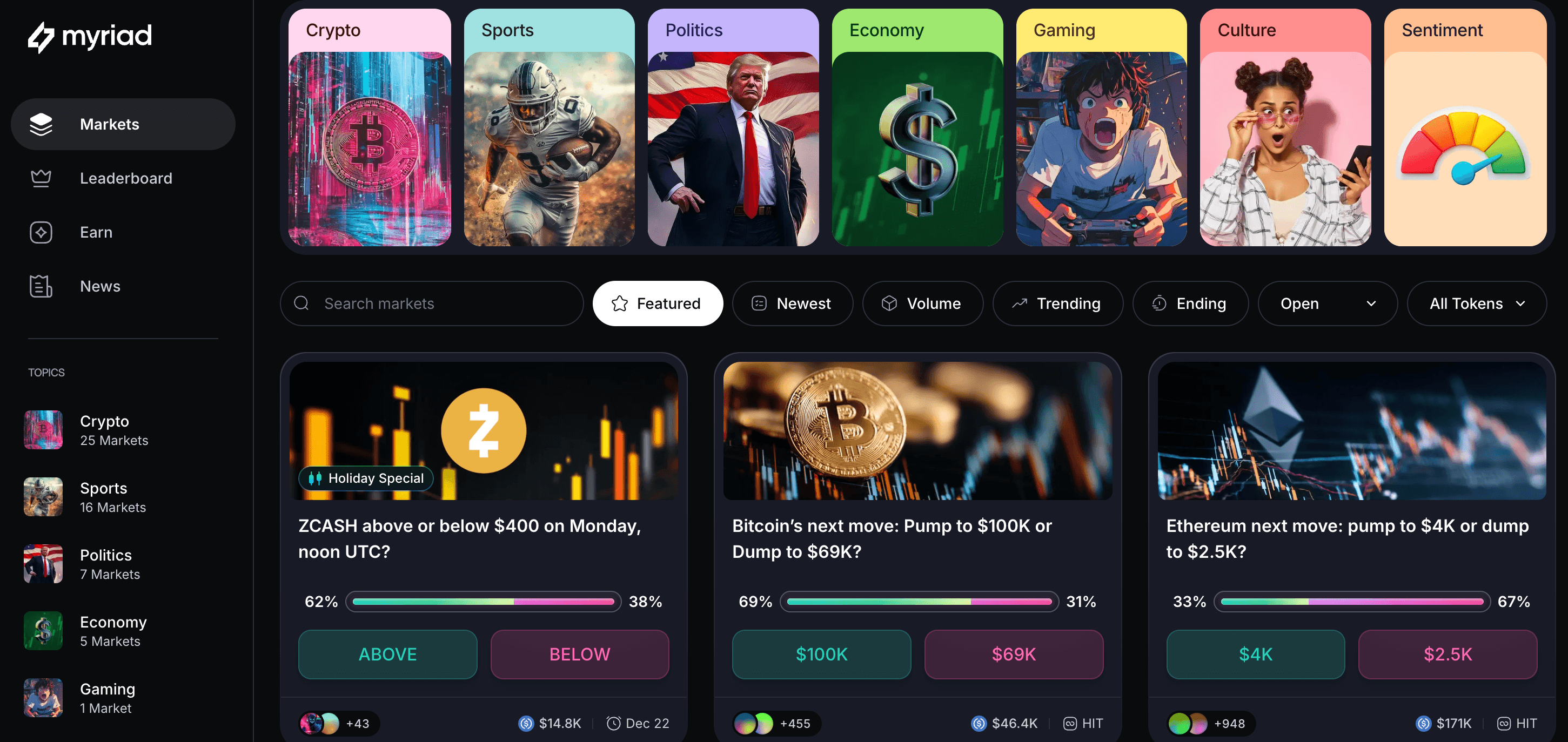 Myriad is an onchain prediction market protocol focused on high-volume, social-first participation across multiple chains. Since launch, it has surpassed $100M in USDC trading volume, with millions of trades and hundreds of thousands of active users. Myriad combines automated market structures with a strong media-driven distribution strategy, positioning prediction markets as a social layer for information discovery. The platform is expanding across chains including BNB, Abstract, and Linea, while also positioning itself as underlying infrastructure for other prediction market applications.