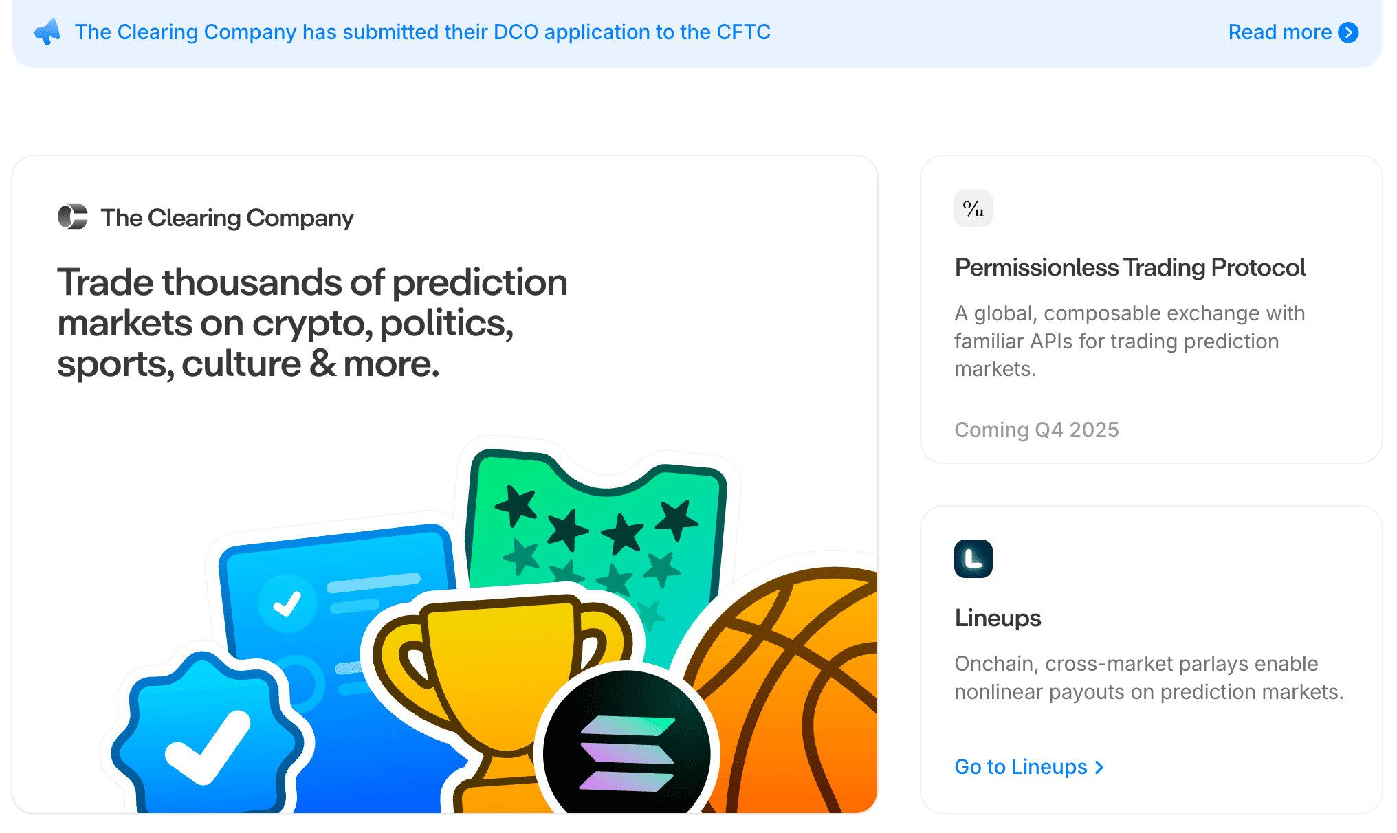 The Clearing Company is building a clearinghouse purpose-built for prediction markets and has filed an application with the US CFTC to become a registered Derivatives Clearing Organization (DCO). If approved, it would operate as a stablecoin-native clearinghouse designed specifically for prediction market activity. Rather than adapting legacy derivatives infrastructure, the company is taking a first-principles approach to onchain clearing and settlement while meeting traditional regulatory standards. It recently raised a $15M seed round led by USV and is led on compliance by former Kalshi Chief Compliance Officer Sam Schwartz.