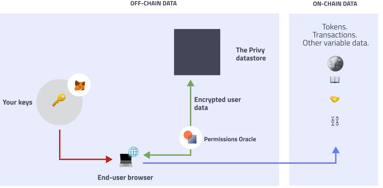 Privy generates new keys for every piece of user data and runs Hardware Security Modules (HSMs) to protect those keys. Data is stored in the cloud and permissions are set by the developer and upheld by Privy’s API.
