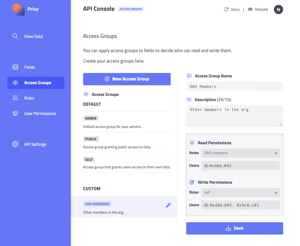 A view of the Privy console where you can set permissions for data.