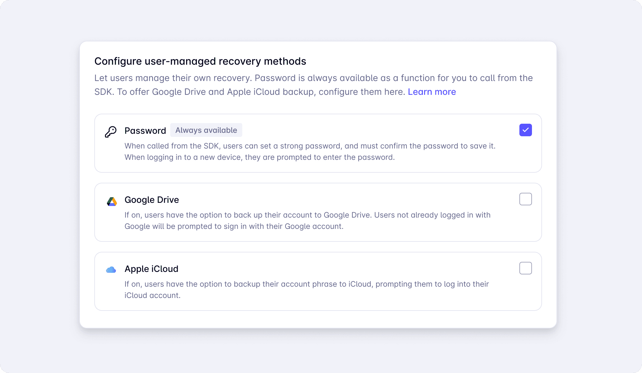 We believe this tradeoff space matters and it is important to offer both options to developers and their users. Users and apps come in all shapes and sizes and certain power users want to control exactly how to secure their recovery system. To that end, we've collaborated extensively with customers to determine the right balance of friction, enabling users to easily set passwords while reinforcing the importance of securely storing them.