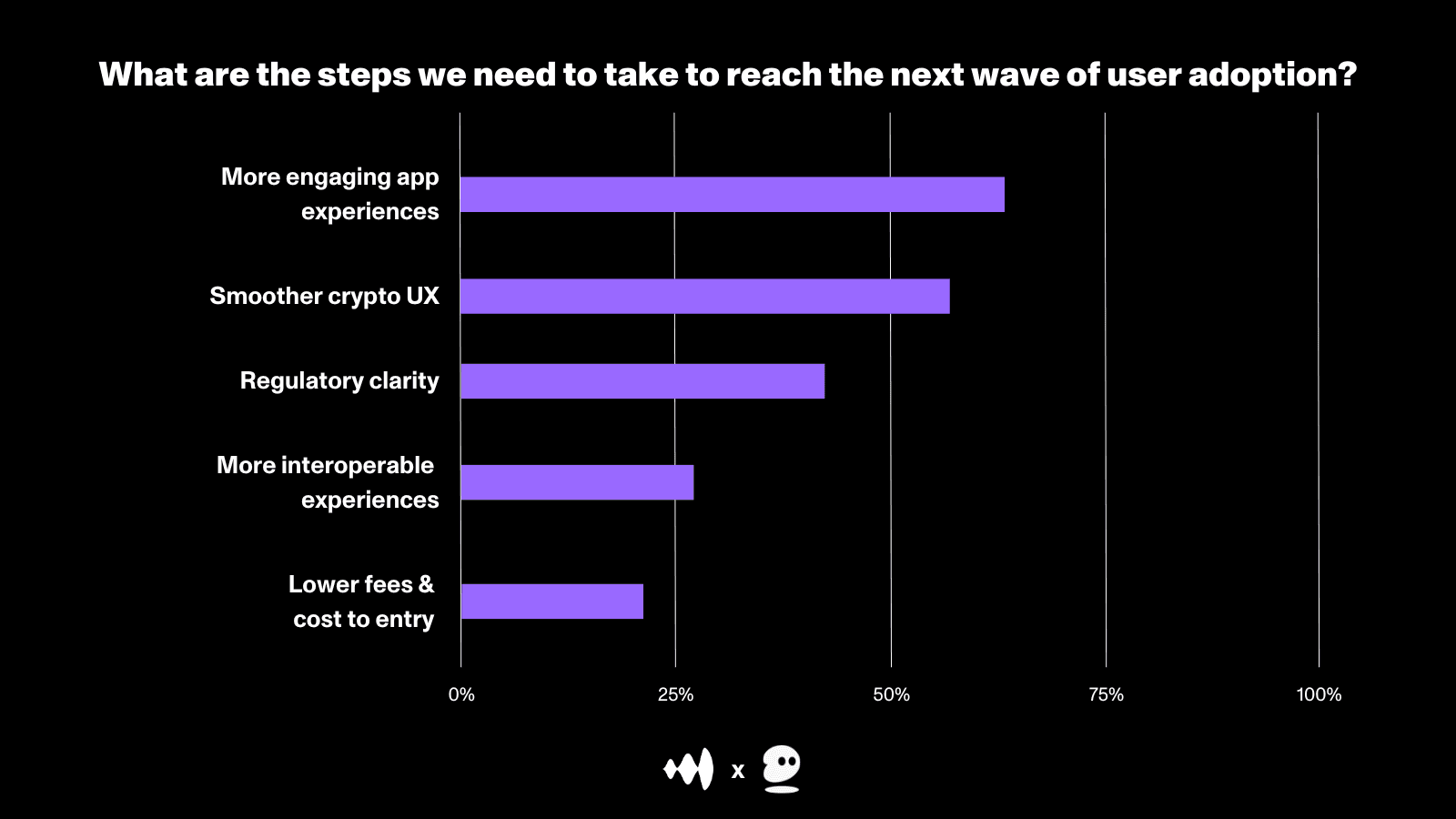 Common hypotheses around crypto building have involved notions of infrastructure and application phases that ebb and flow on a steady upward growth trajectory. Apps inform new areas where more infrastructure is needed to be built, which breeds new applications and use cases, which exposes new holes in the infrastructure, and so on and so forth. Beyond anything else, >50% of respondents highlighted the need for continued experimentation and more consumer apps in crypto. Infrastructure can only get us so far if it is not used to power new projects.