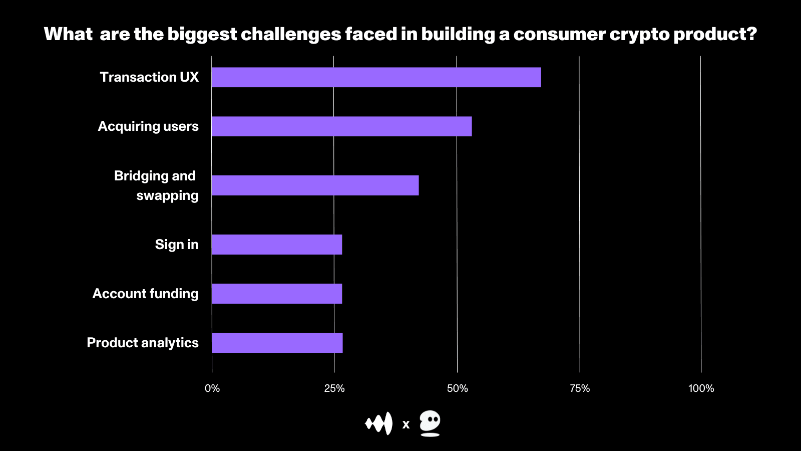 Every (onchain) action in a crypto application is a transaction. At a minimum, transactions require paying gas. To date, this has meant getting a wallet, onramping assets, and getting them on the right chain, creating a financial and technical barrier to adoption. Historically, most crypto apps have either been shallow uses of blockchains, or complex interactions for technical users. It makes sense that ~75% of consumer crypto founders agree transaction UX poses the biggest challenge to building a great consumer crypto app. Respondents that elaborated said things like: