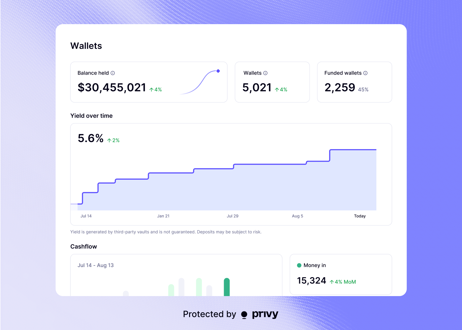 Connect idle balances to curated DeFi vaults through Privy to expand revenue opportunities from wallet assets.