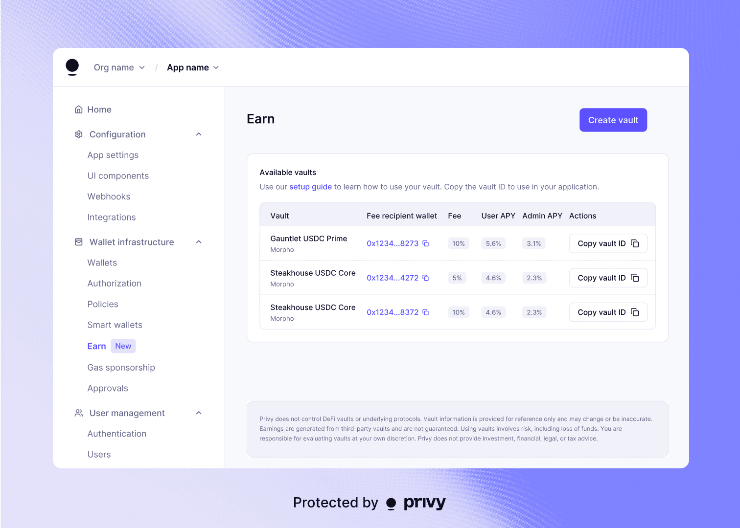 Privy does not control DeFi vaults or underlying protocols. These materials are for general information purposes only and are not investment advice or a recommendation or solicitation to engage in any specific transaction. Using vaults involves risk, including loss of funds. You are responsible for evaluating vaults at your own discretion. Privy does not provide investment, financial, legal, or tax advice.