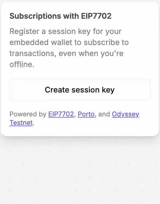 In this demo, you can login with your preferred authentication method, create an embedded wallet, and use the wallet as you normally would. From there, EIP7702 enables you to create a “subscription” by registering an app session (in this case a passkey) as an authorized signer on the wallet, granting it certain permissions such as withdrawing a given amount from your wallet at known intervals.