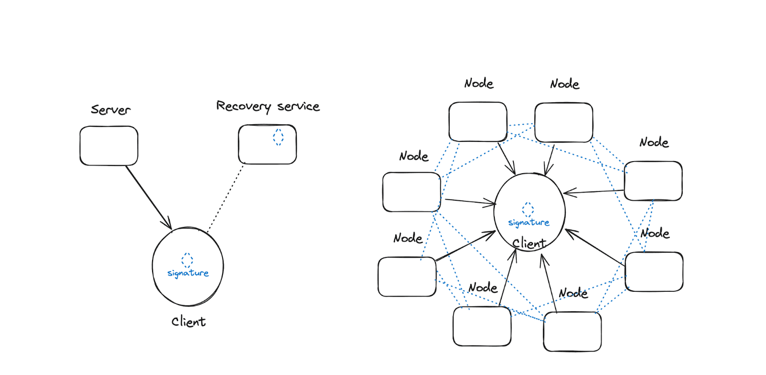 Performance challenges: In practice, TSS-based systems suffer from higher latency at scale and require server roundtrips for every generated signature (this is made far worse in a larger network design). What’s more, many of the TSS algorithms are not particularly efficient when run over ECDSA (Ethereum’s core transaction signature algorithm today) which adds to the latency (AA will help here).