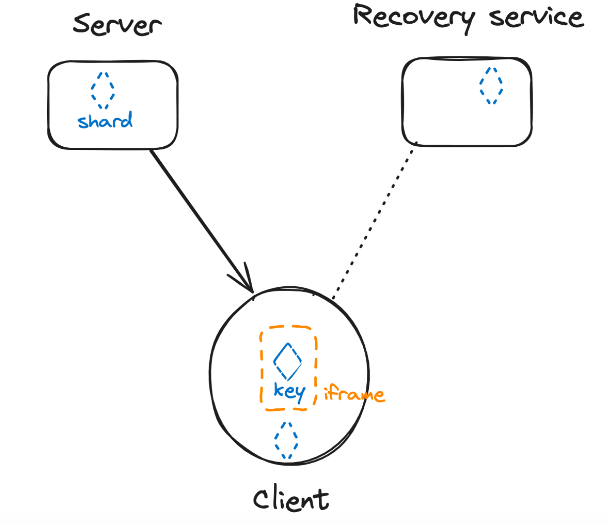 1,000 foot view: Shamir’s Secret Sharing algorithm splits the private key into multiple key shares. A given number must be recombined to enable the initial key to be recovered. In order to ensure self-custody using an SSS scheme, we considered a construction that only ever handles (splits, reconstitutes or signs with) the private key in an isolated environment in the user’s client on their device. This is essential to ensuring the system is self-custodial but it means doing a lot of work to secure the client-side environment (user’s browser or device).