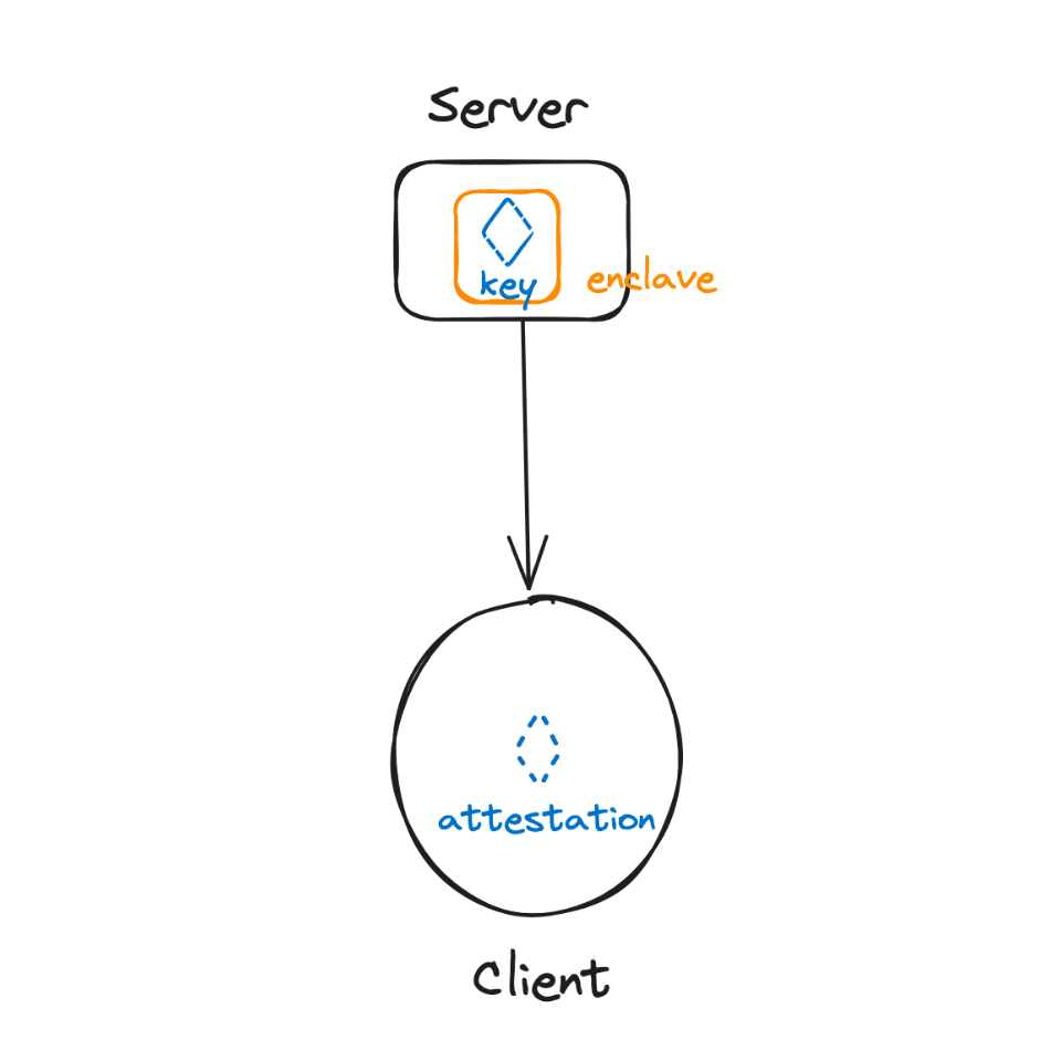 1,000 foot view: Systems based on Trusted Execution Environments take an altogether different approach to this problem. Namely, all operations involving the private key are run in a trusted environment (or enclave). This trust is enforced via software and hardware guarantees (through platforms like Intel SGX or AWS Nitro Enclaves for instance). Authorized code is run on remote instances (the enclave) with isolated CPU and memory resources to ensure it cannot be monitored. These enclaves can generate attestations proving operations were run properly. In constructions considered here, the work is split between the client and server, with the server running most computation in an enclave, and generating appropriate attestations that are verified client-side so the user can verify what code is run on a secret only they should have access to.