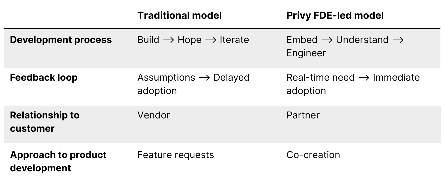 At Privy, we’ve adapted this model to serve customers who are both crypto-native and entirely new to the space. Our FDEs aren’t just assigned a single support ticket. Rather, they sit in weekly product calls, debug live in customer environments, and also ship real features based on evolving user needs. When a customer hits a blocker, a Privy FDE aims to unblock it as quickly as possible, not defer it to a future sprint or quarterly roadmap.