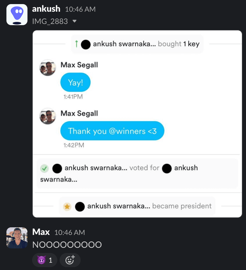 Clubs: They’re like group chats, but with a friendtech twist. Once a user creates a club, anyone can join it by buying its keys with the in-app currency, $FRIEND (more below). Club key prices are subject to bonding curves like individual users’ keys in v1. All keyholders get a vote on the club’s president, who gets to manage the club and choose moderators and silence users. The president voting dynamic creates a fun, chaotic social dynamic, that’s already stirring up drama among Privy teammates (per the below).