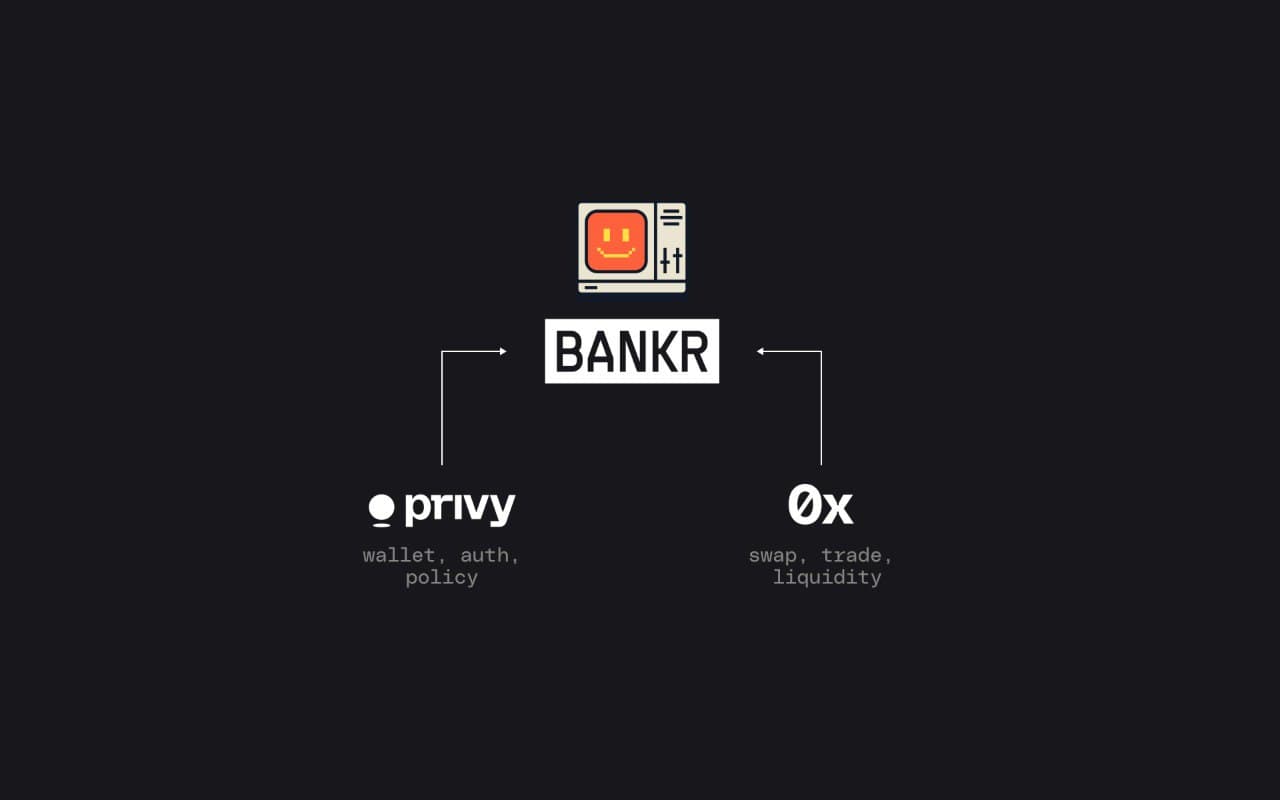 Bankr is an AI trading companion that lives in social feeds. Users trade directly from Farcaster, X, Telegram, or Discord using natural language commands. A user types "buy $200 of $TOKEN" in a reply, and Bankr handles everything end to end: Privy wallets power the custody and signing, 0x powers the swap routing and price optimization. The user never interacts with a DEX interface or approves a transaction manually.