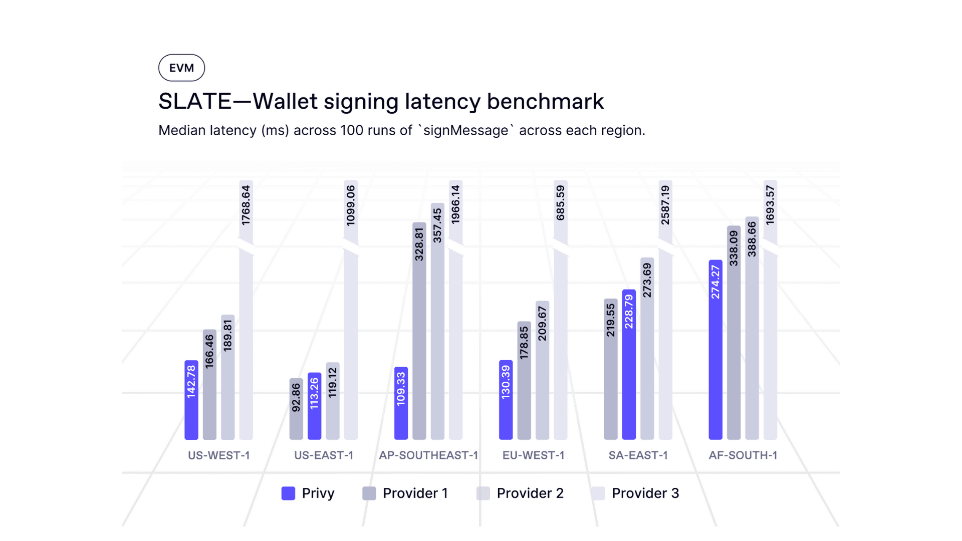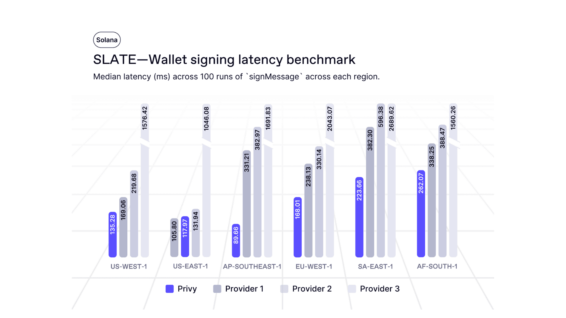 For instance, the results below compare Privy to other wallet providers across 6 global regions on both EVM and Solana (note that Privy on-device signing has <5ms performance).