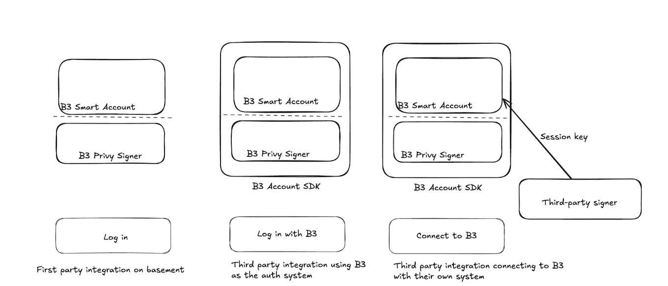 The B3 brand shines through across these games, and game developers decide how and when to integrate B3: some may choose to have users log in with their B3 accounts upfront, others will have users connect back to B3 later in their session. Through this all, any developer can use B3 wallets directly, abstract gas away from users, and plug directly into the account system with scoped session keys for deeper customization.