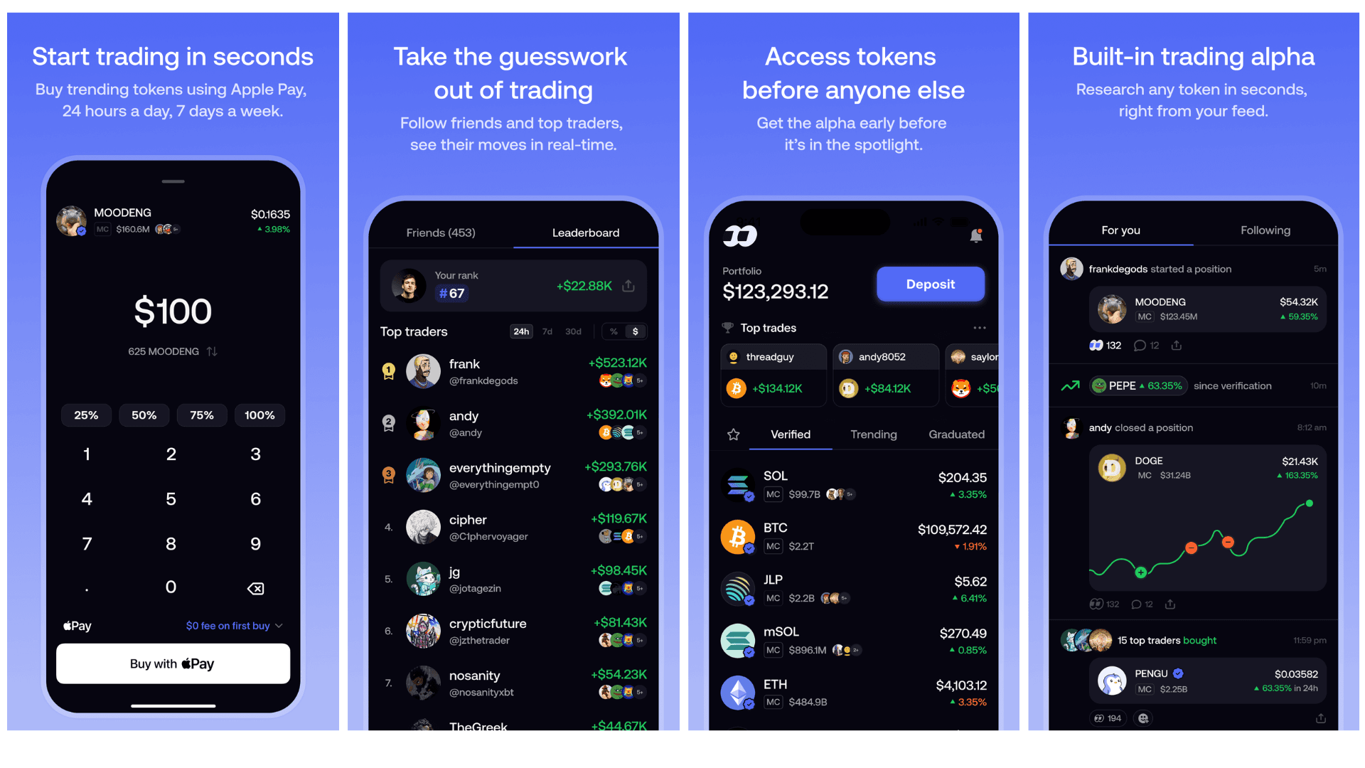 Within the app, users can see what their friends and top traders are buying in real time. This turns insights that once lived in private group chats into a shared, transparent feed. Buying is just as fast: users can purchase trending tokens in seconds with Apple Pay or a card, without ever leaving the app.