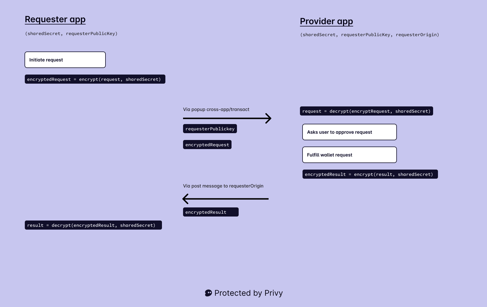Now, the requester and provider application both have the same sharedSecret stored in the browser. When the requester application wants to use the provider’s wallet, it encrypts the request using the sharedSecret.