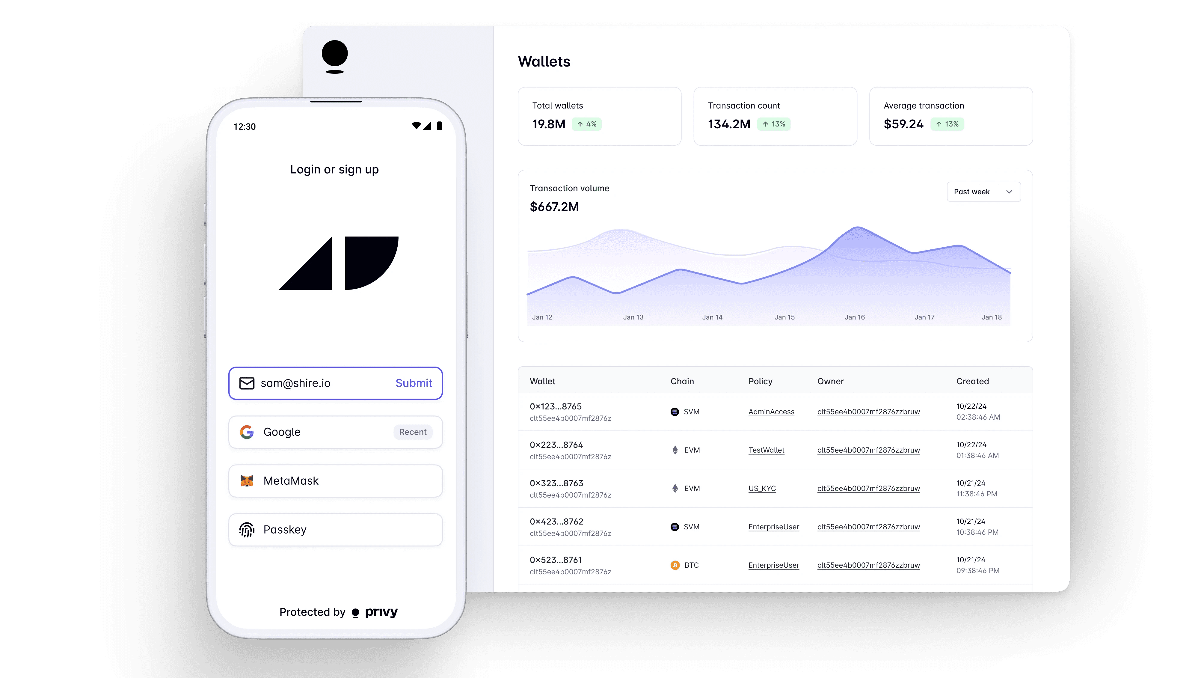 Whether you’re building in-app wallets or orchestrating them from the key layer, Privy’s infrastructure lets you manage keys, enforce policy, and scale secure wallets everywhere users go.